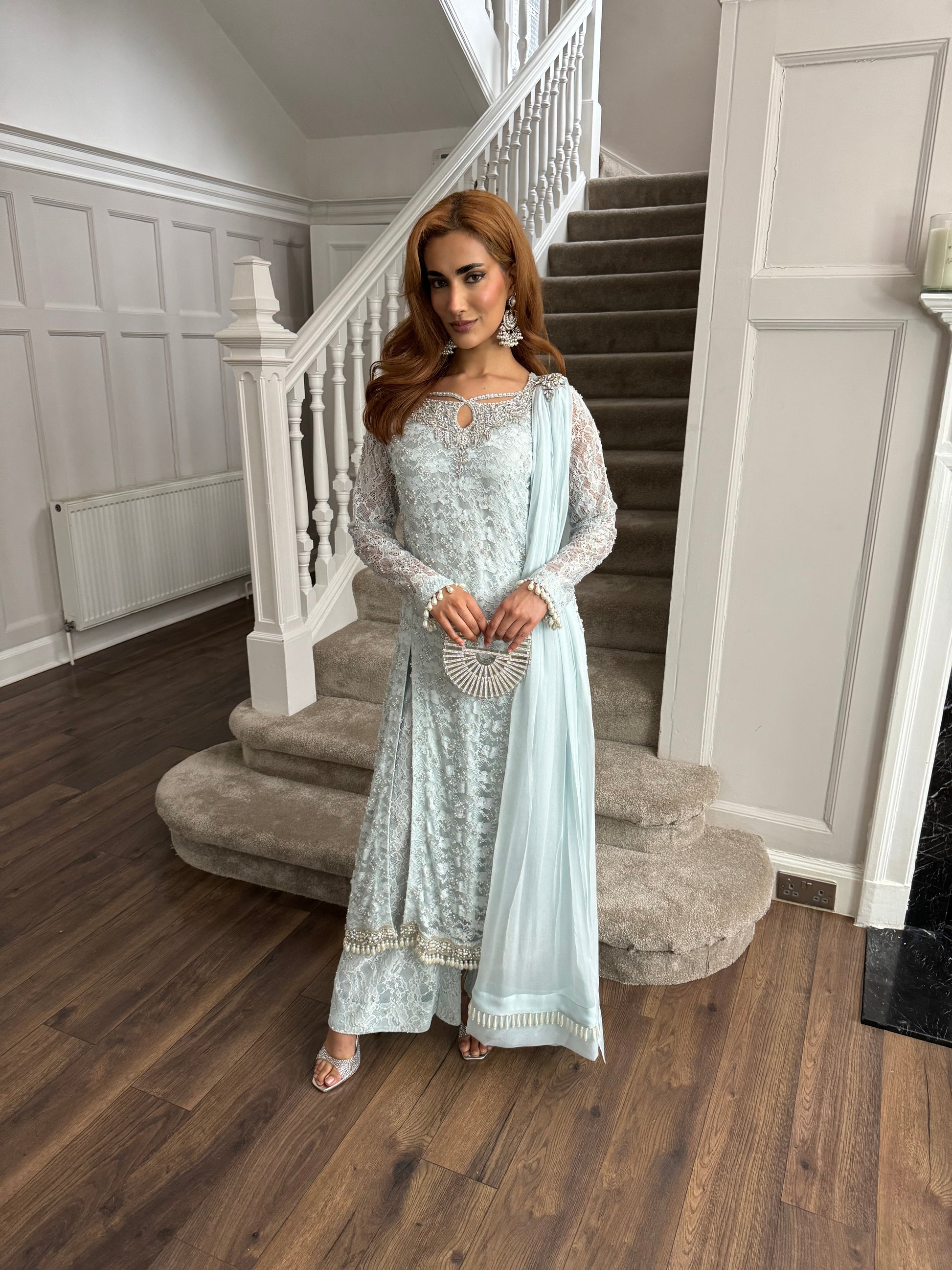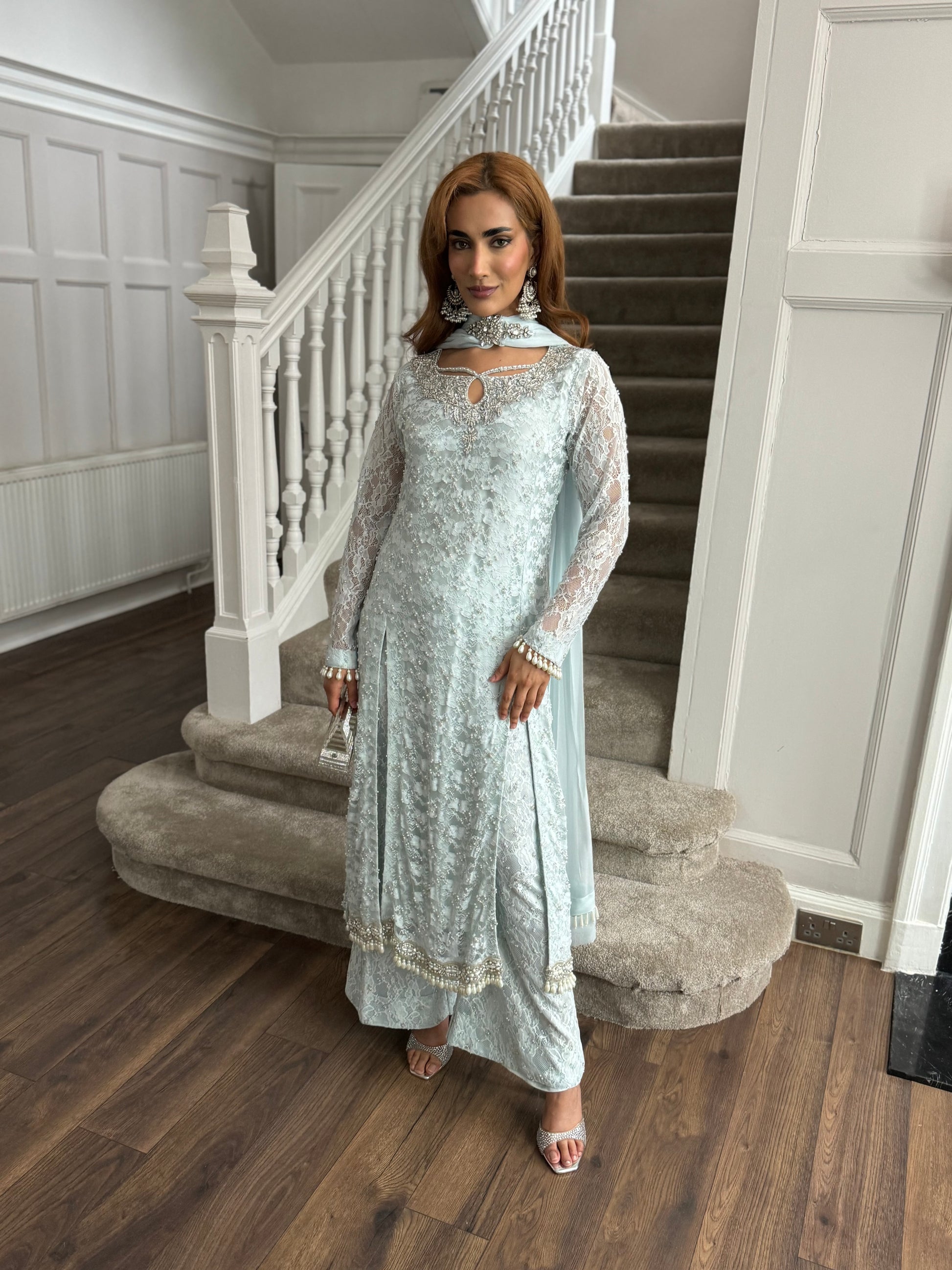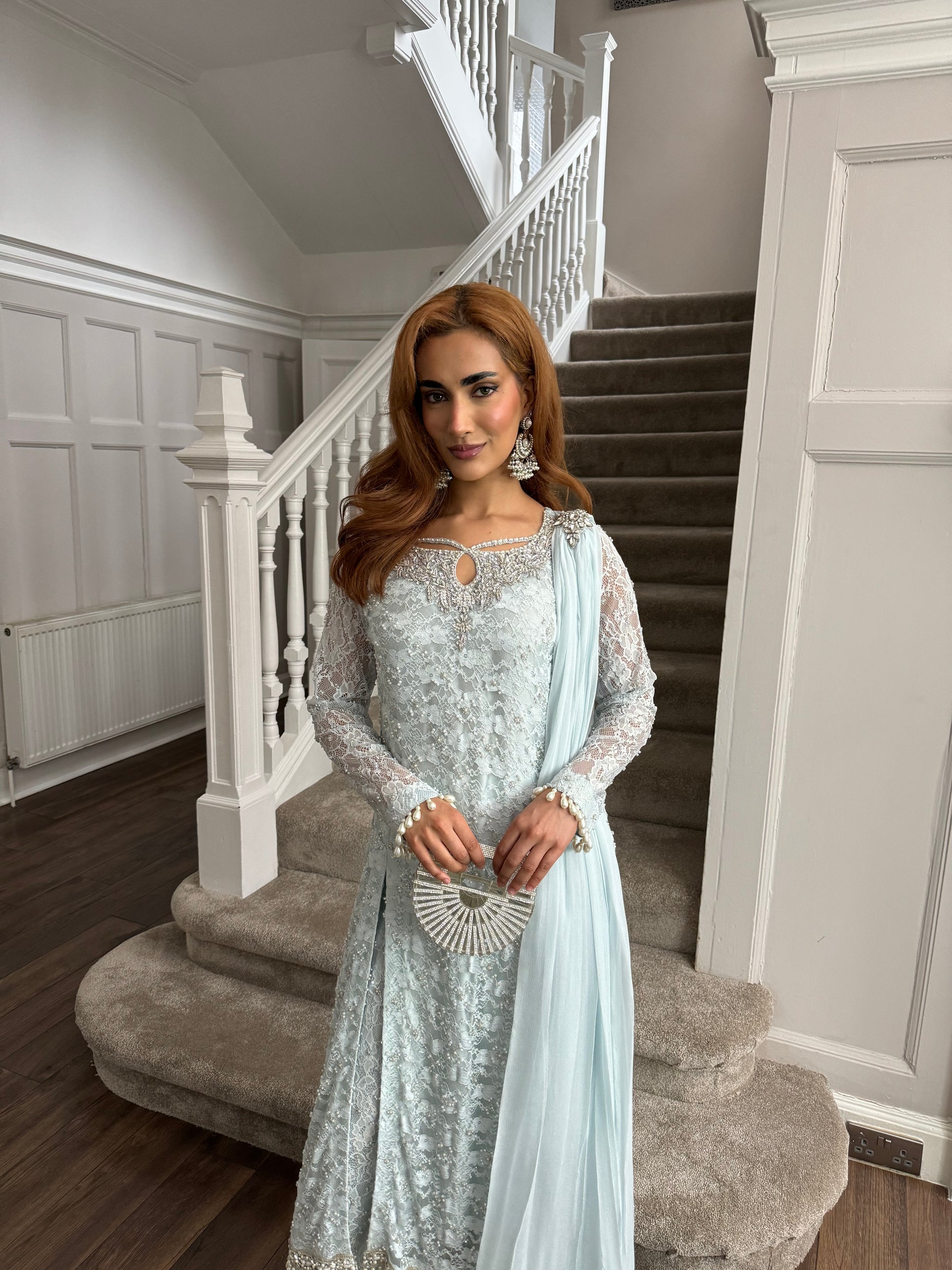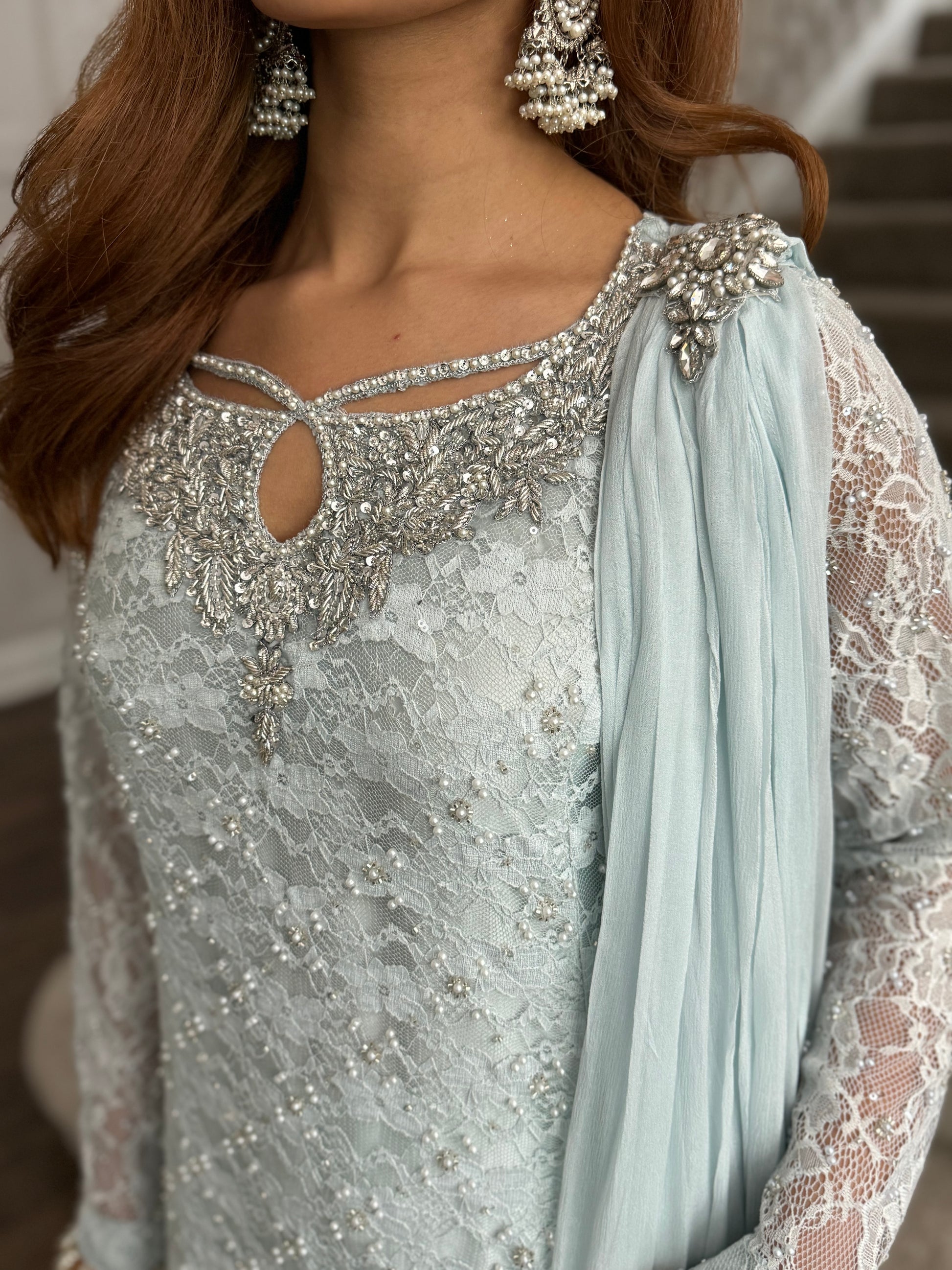 A soft ice-blue lace ensemble featuring delicate embellishment at the neckline and sheer embroidered sleeves. Finished with elegant detailing and a flowing silhouette, perfect for weddings and special occasions. ✨