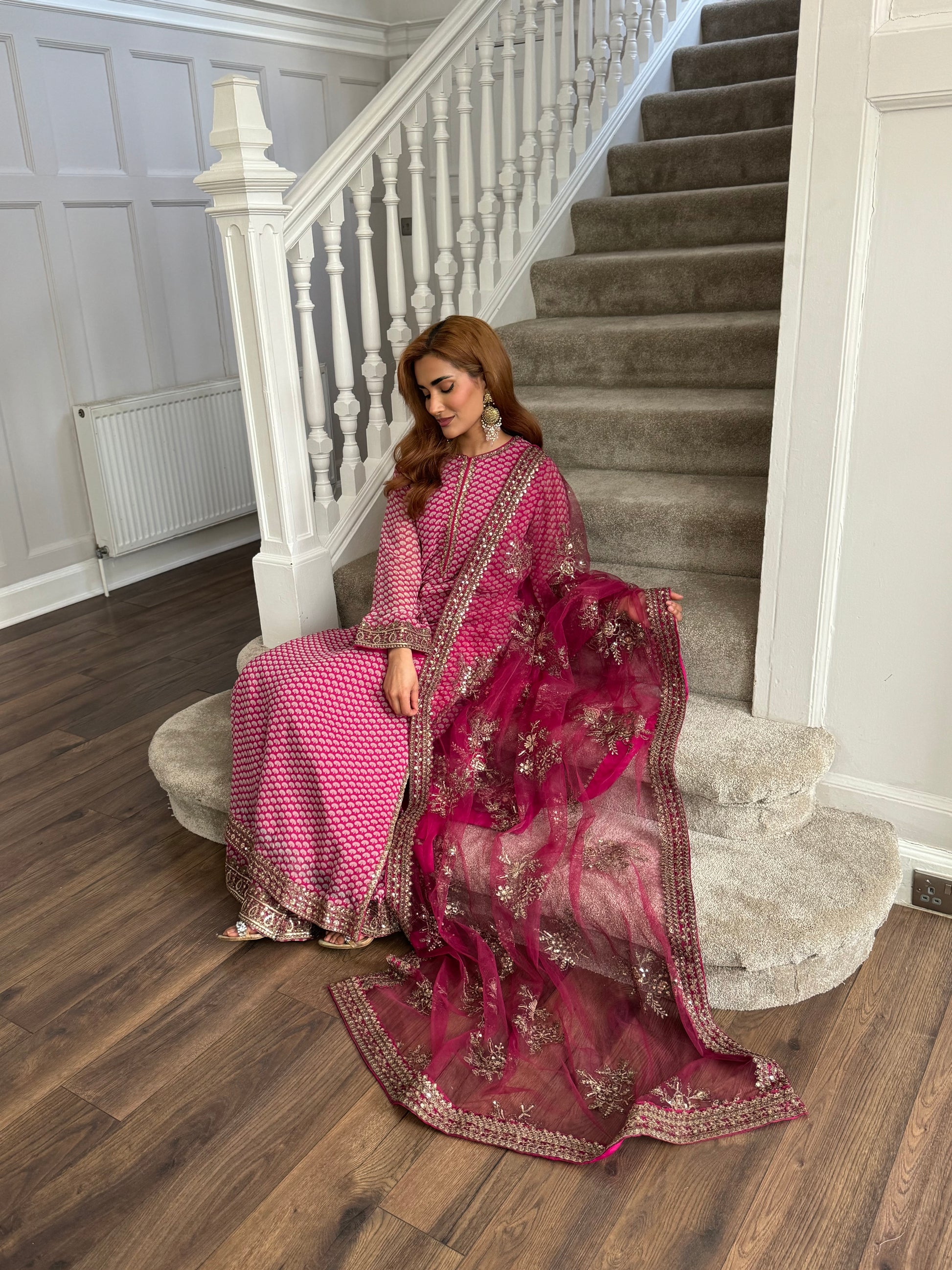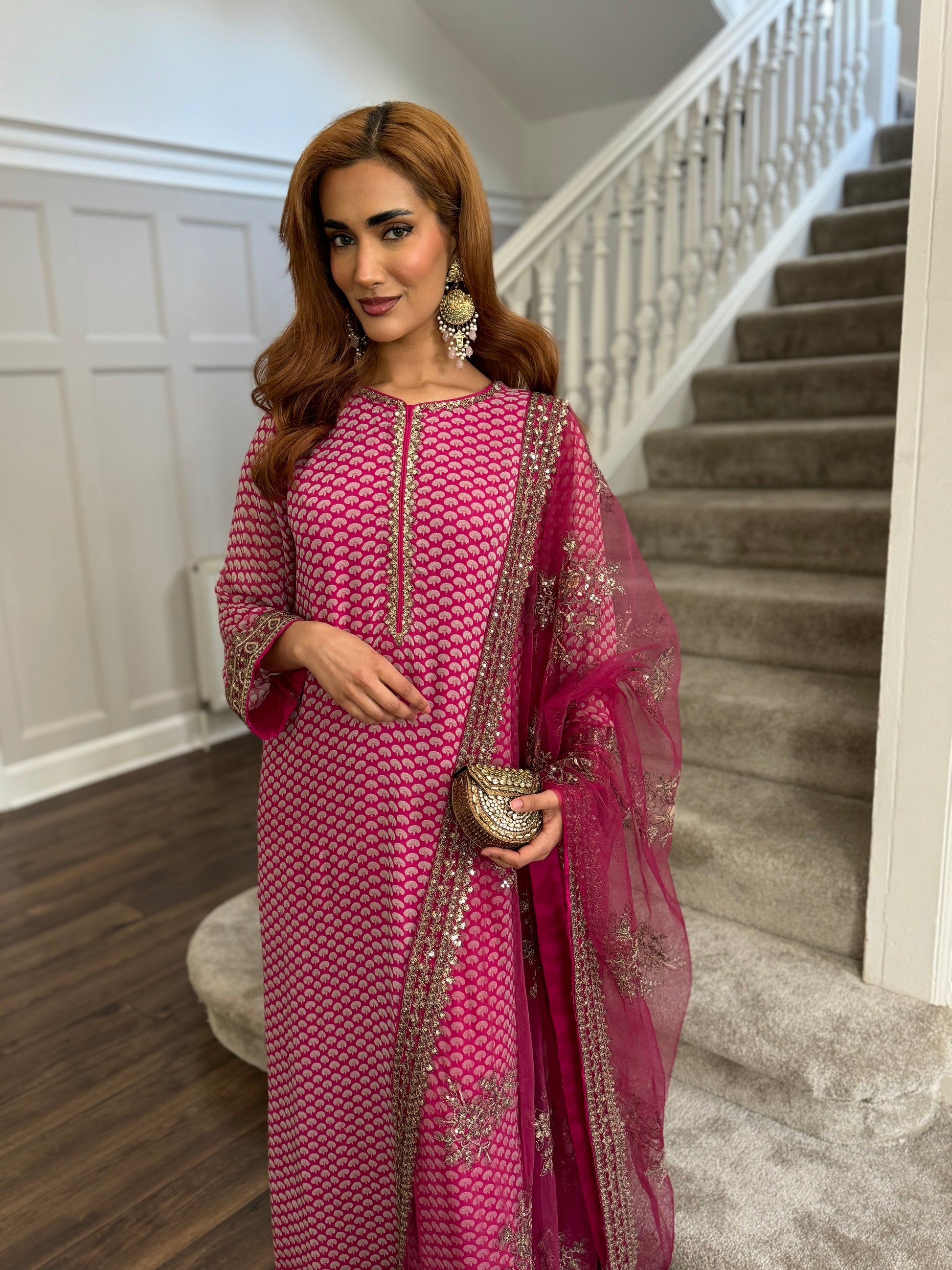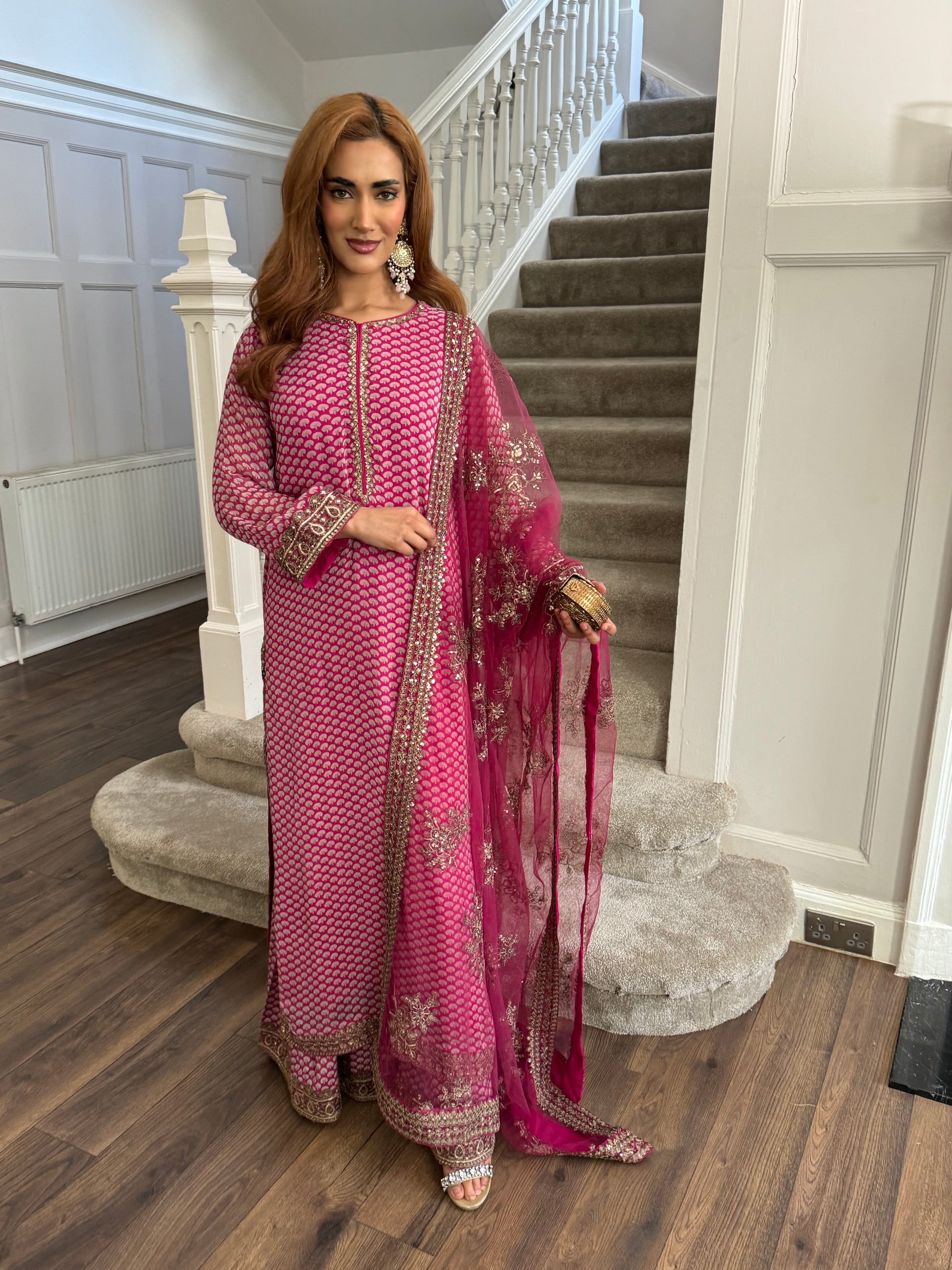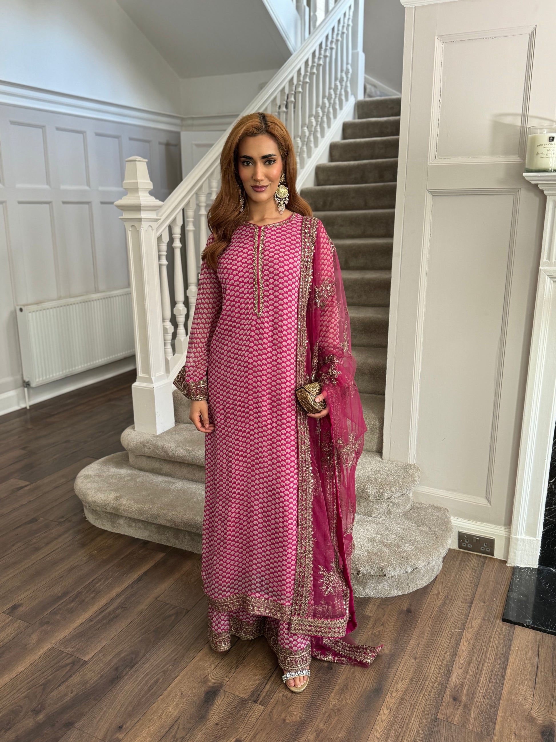 Turn heads in this vibrant original designer Charizma ensemble, adorned with delicate gold motifs and intricately embroidered borders. Paired with coordinated trousers and a beautifully detailed net dupatta, this suit blends timeless elegance with bold sophistication — perfect for weddings and festive celebrations. ✨