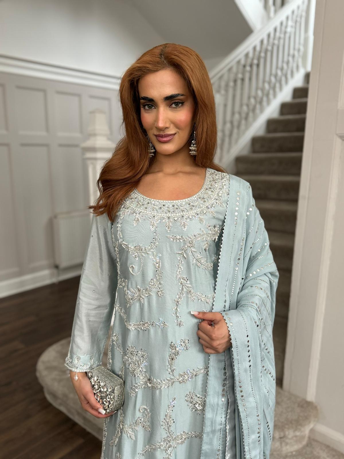 Soft, serene, and effortlessly elegant ✨ This dreamy powder blue ensemble is adorned with delicate silver embroidery and subtle shimmer detailing, paired with a beautifully embellished dupatta. The perfect choice for weddings, engagements, and festive occasions where grace meets glamour.