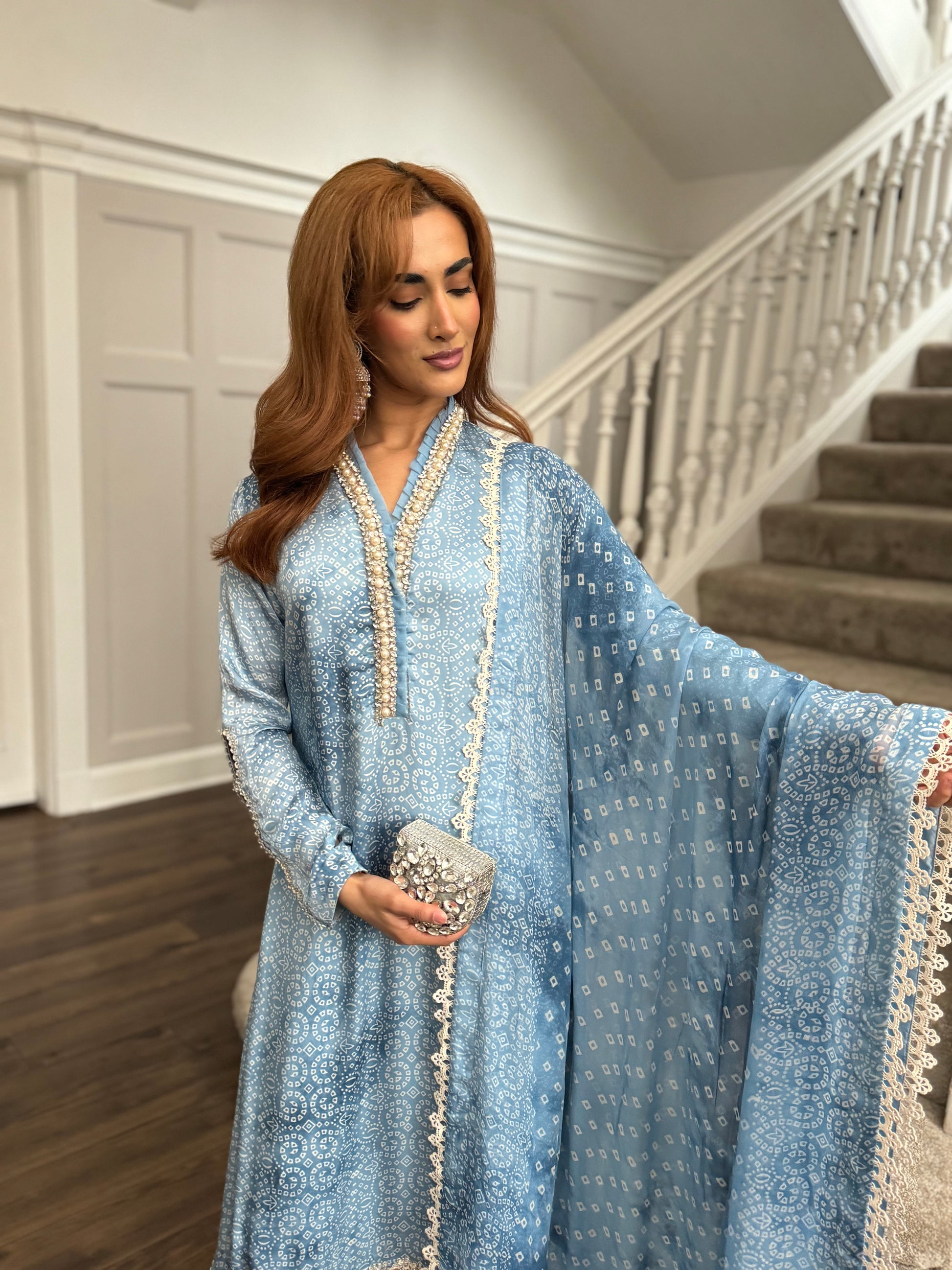 A beautifully detailed powder blue silk ensemble featuring delicate traditional patterns and soft lace accents along the neckline and borders. Paired with a flowing matching dupatta and tailored trousers, this elegant set is perfect for daytime festivities, intimate celebrations, and graceful occasion wear. Gorgeous detailing, perfect for Eid ✨