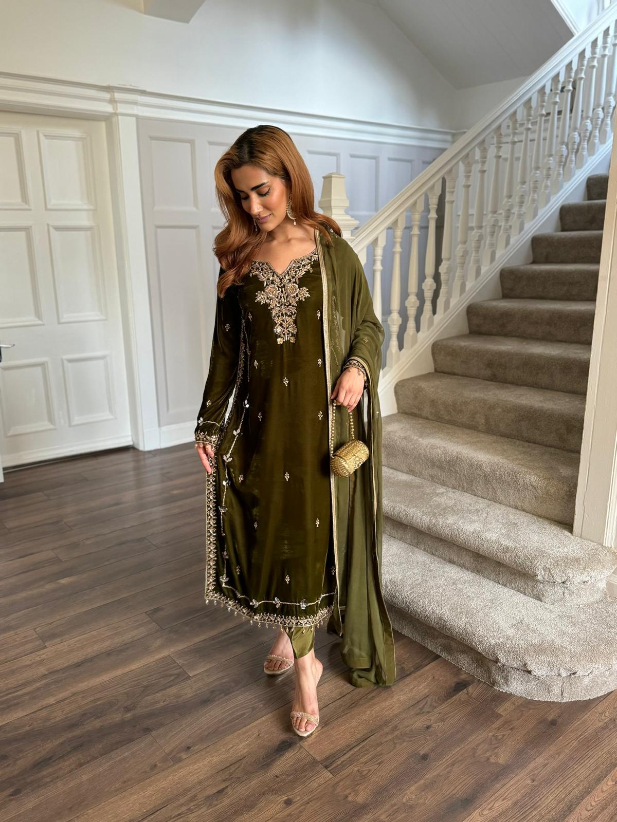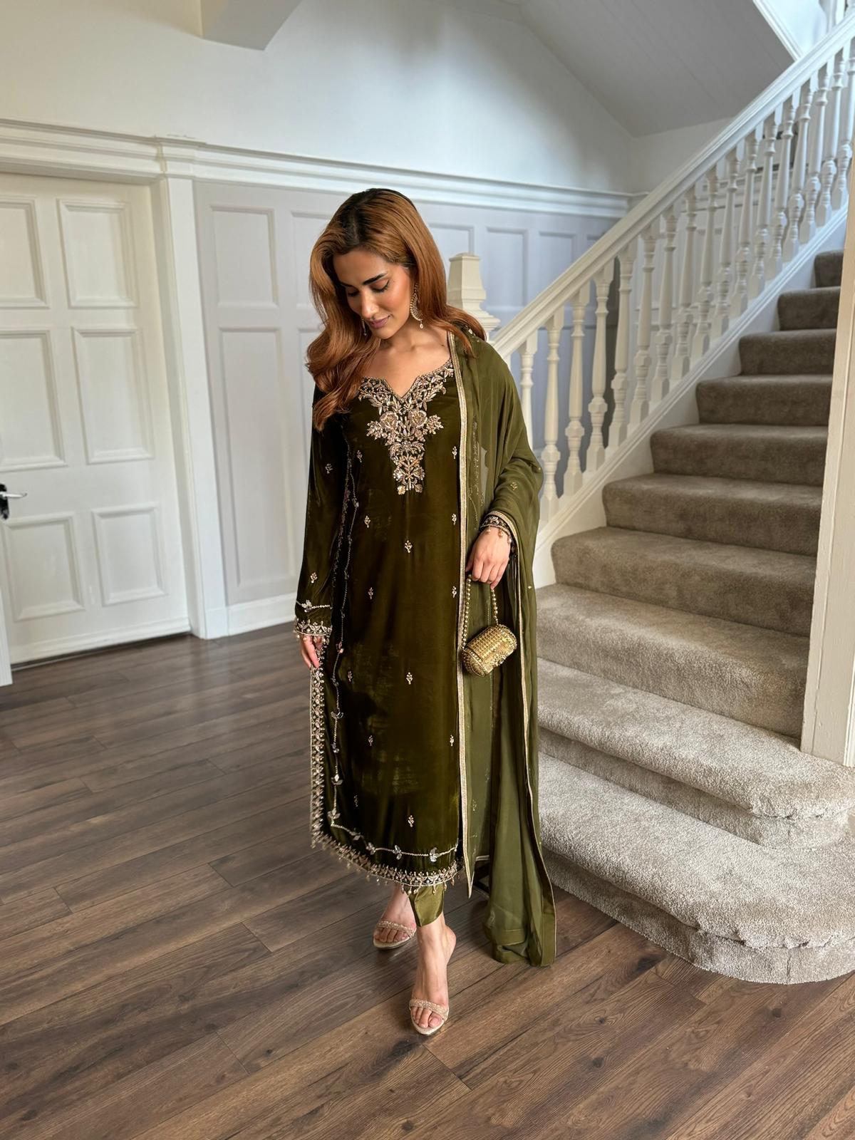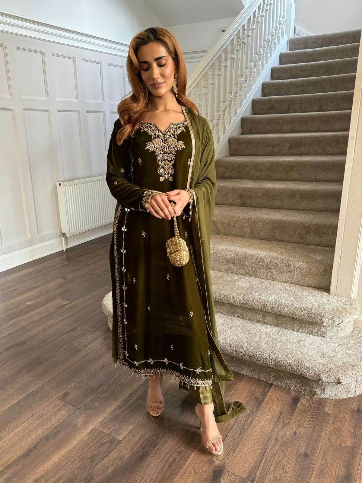 Luxurious velvet green outfit adorned with intricate gold embroidery, designed to make you stand out at any wedding or festive event. Soft, rich, and effortlessly elegant.