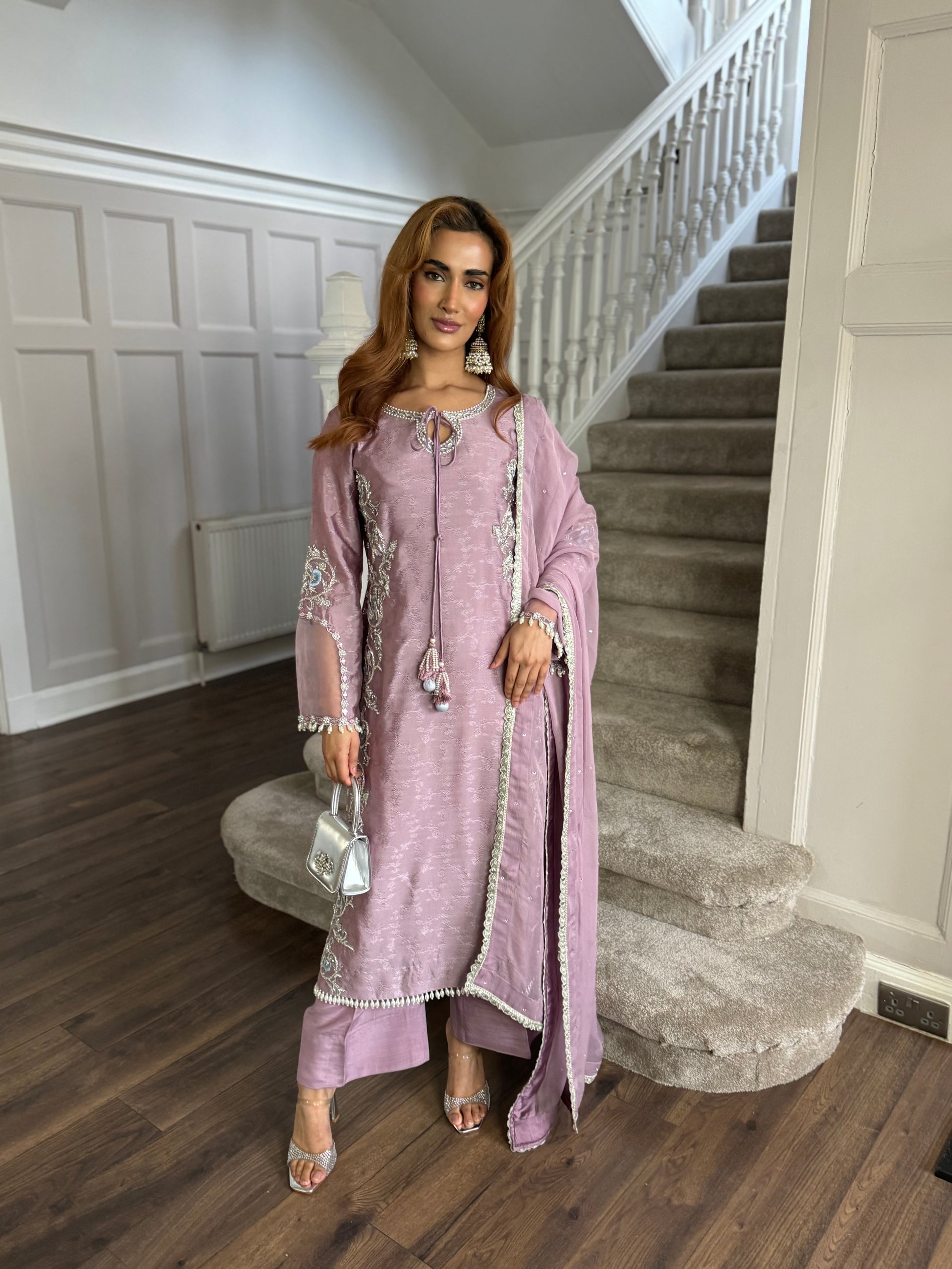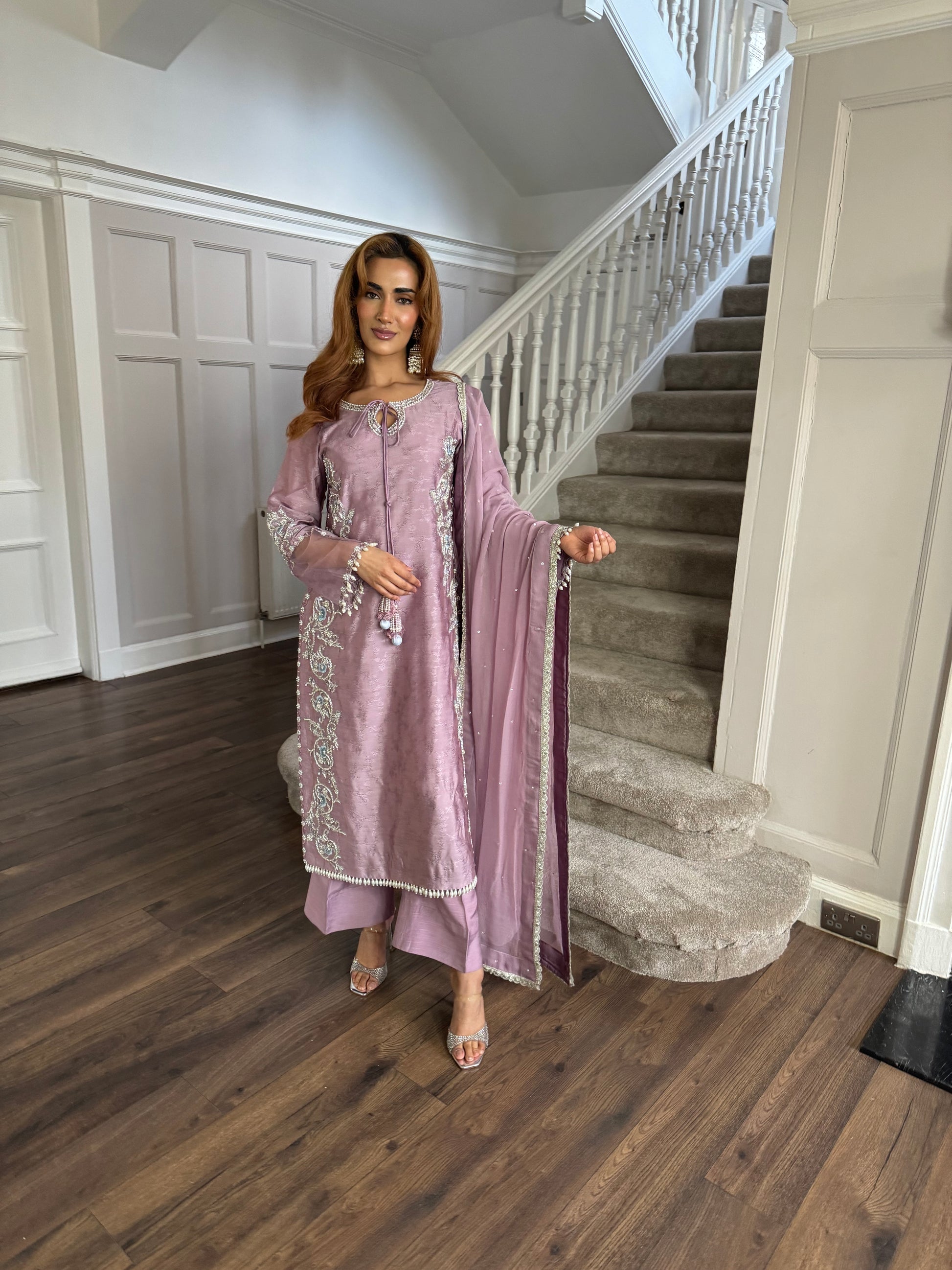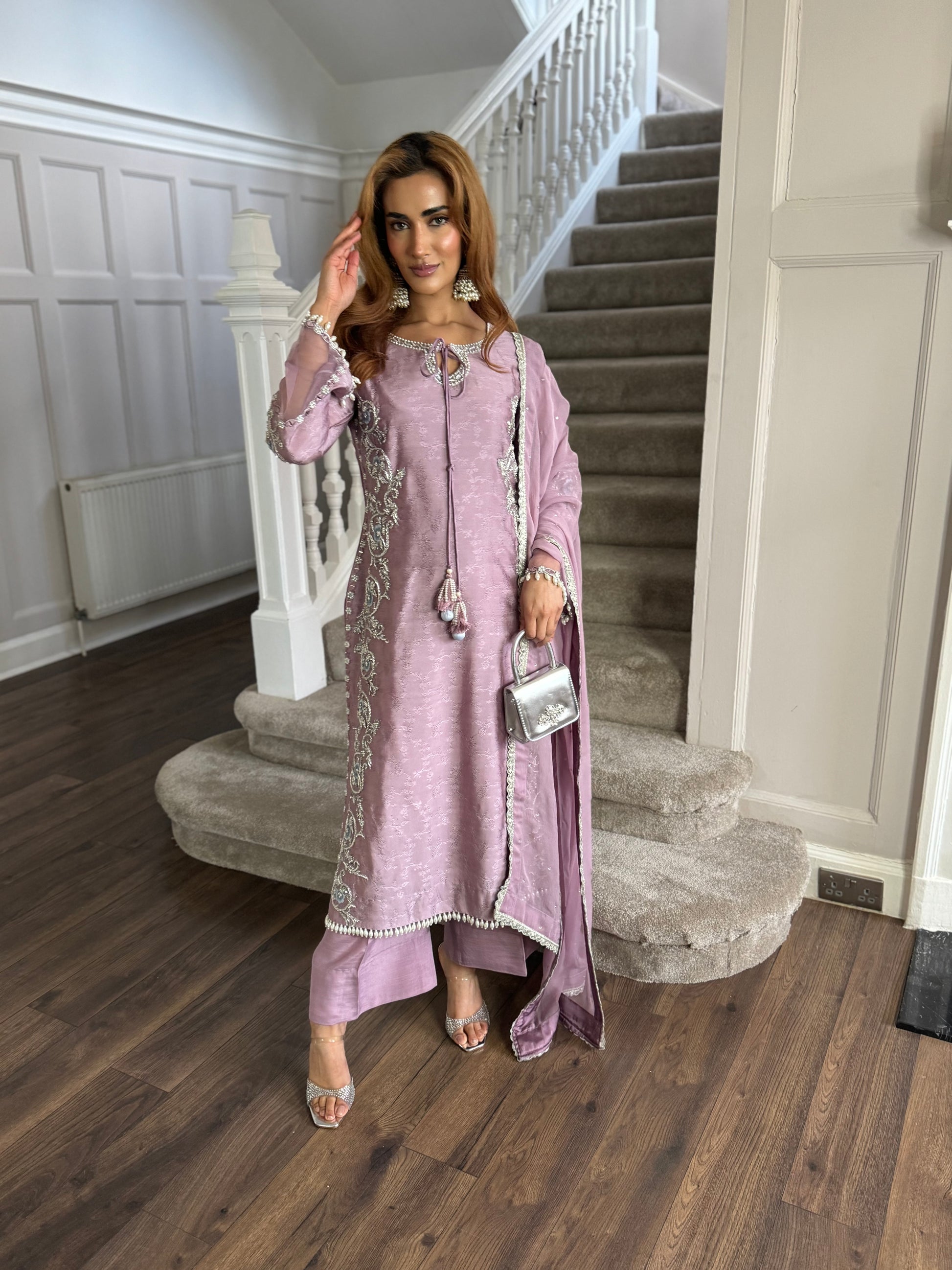 Soft, graceful, and effortlessly regal — this Sophie’s Pret ensemble is a must have this season. Adorned with intricate silver embroidery along the neckline, sleeves, and side panels, the design beautifully enhances the silhouette while maintaining a subtle, luxurious charm.