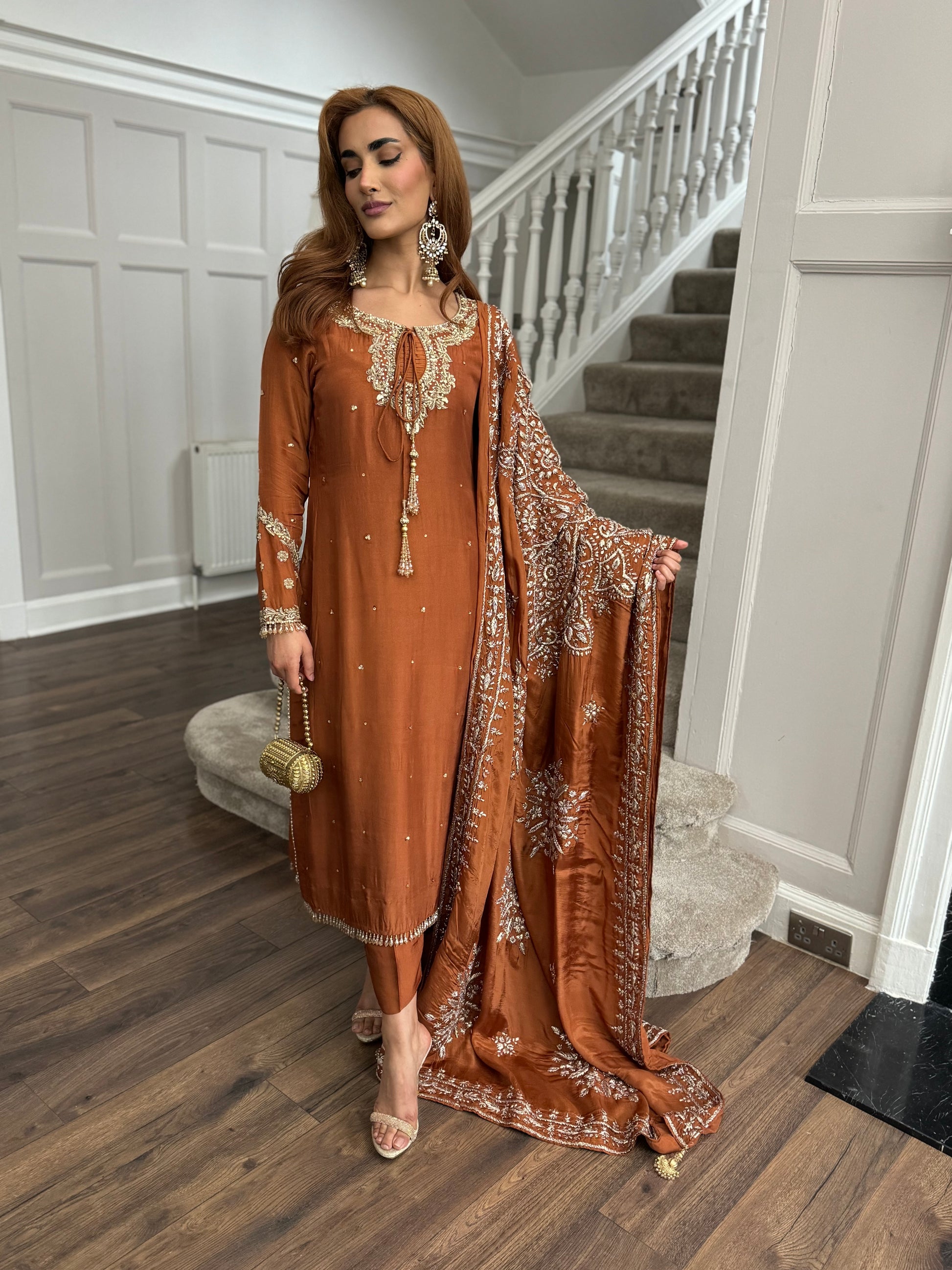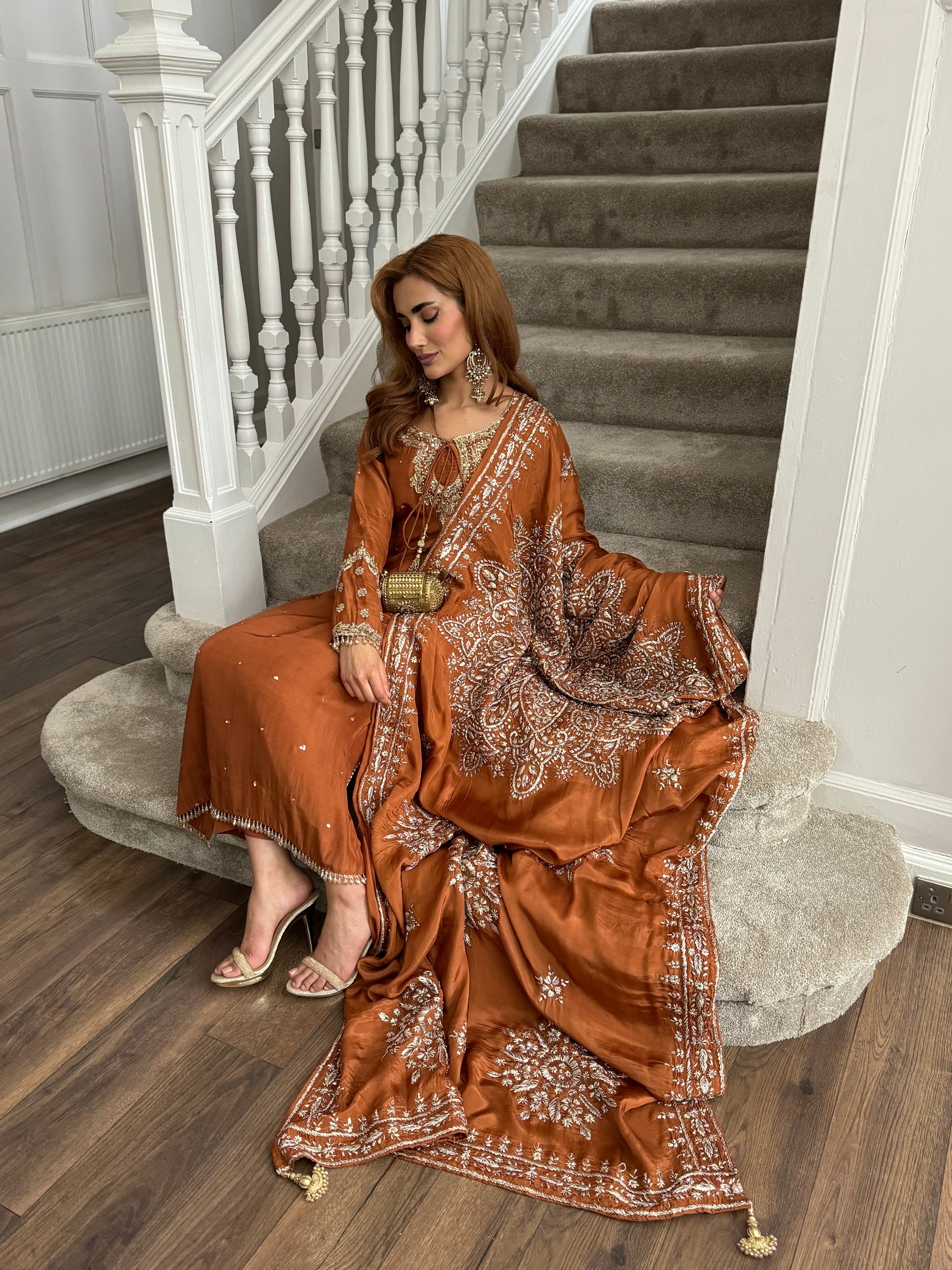 A rich burnt-orange three-piece set featuring delicate embroidery on the neckline and a statement embroidered dupatta. Elegant, refined, and perfect for weddings or festive occasions. ✨