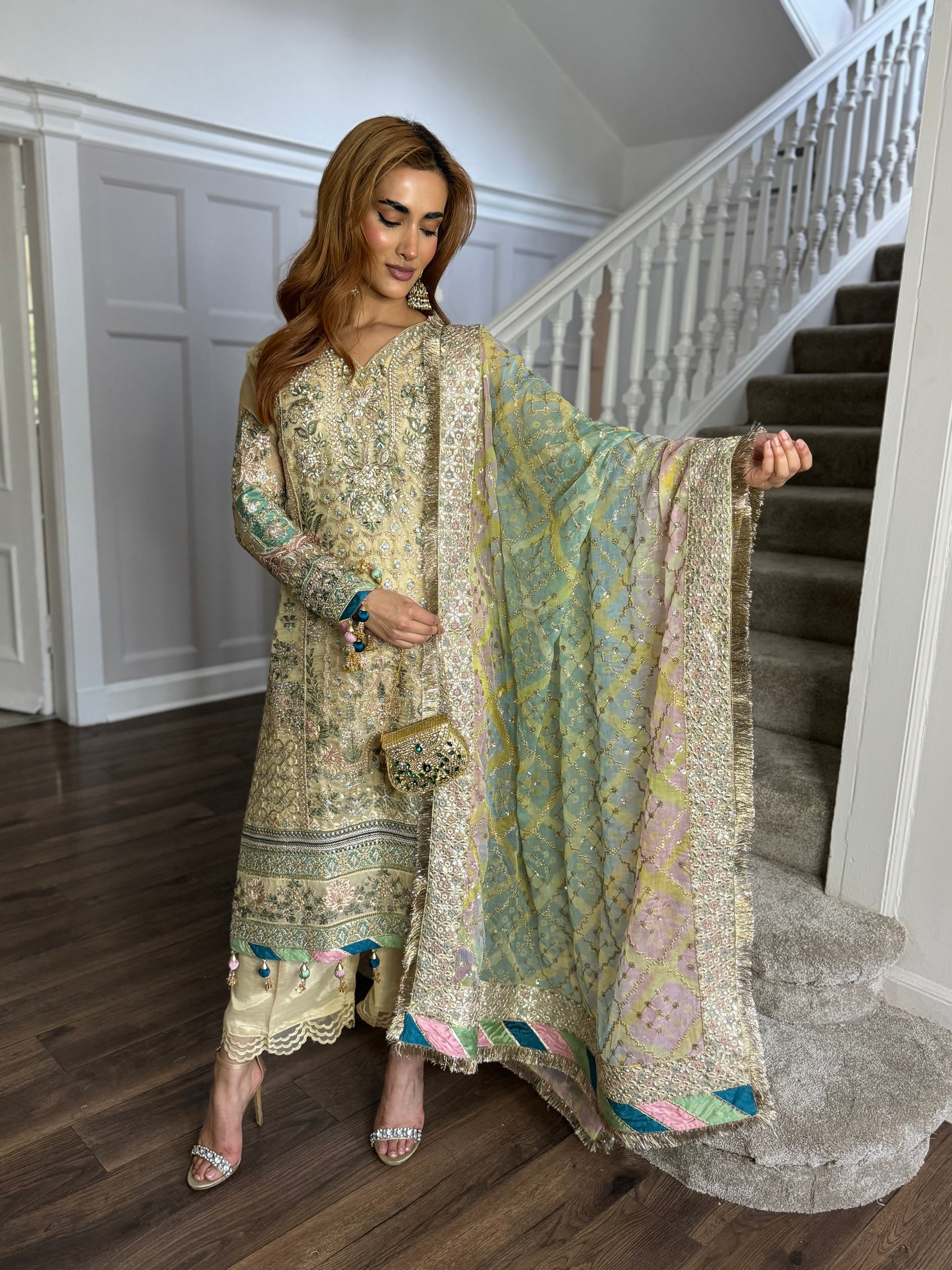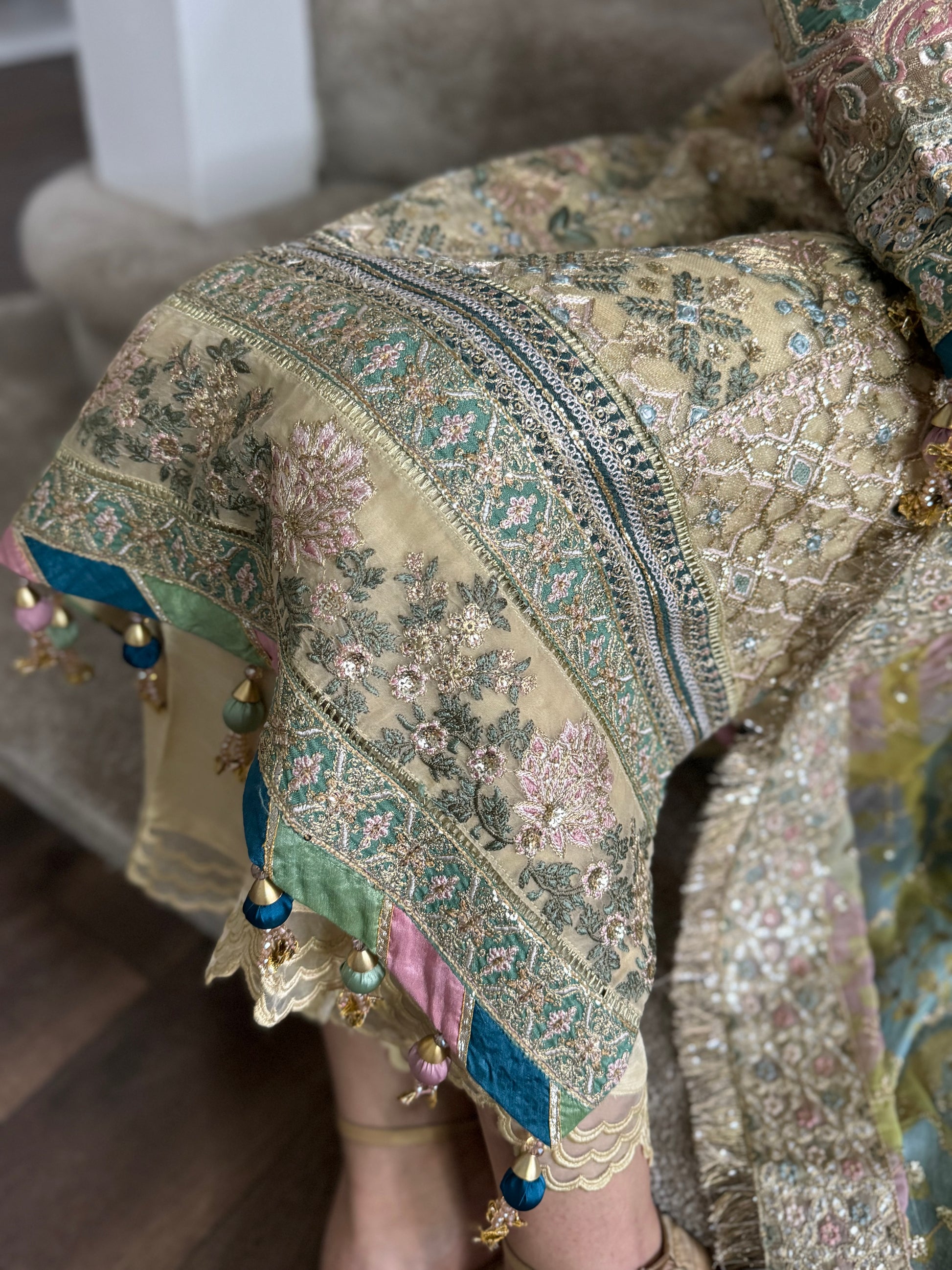 Elevate your festive wardrobe with this original Baroque ensemble, exquisitely crafted with intricate hand embellishments and rich detailing. The soft pastel palette is beautifully enhanced with delicate embroidery, shimmering accents, and a statement dupatta featuring ornate borders and subtle gold motifs. Paired with elegantly tailored trousers and refined accessories, this outfit blends timeless tradition with modern sophistication — perfect for weddings, soirées, and special celebrations.